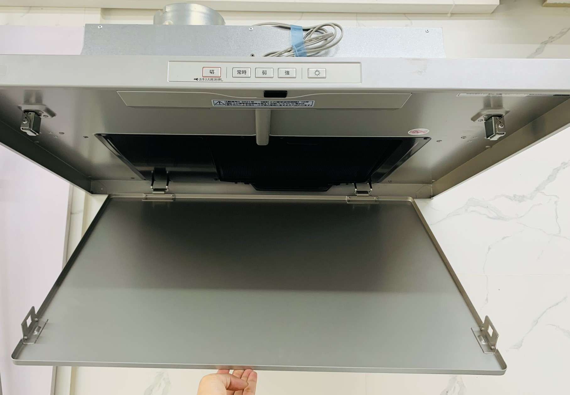 Mặt hút mùi bếp nội địa Nhật được thiết kế từ tấm tôn lớn, giúp cản trở mỡ đi vào phía trong và giúp mỡ bị phá vỡ ngay trên tấm tôn lớn, giúp người dùng dễ dàng lau chùi. Tấm tôn rút ra và gắn vào với 2 lẫy mở đơn giản giúp vệ sinh hút mùi đơn giản nhất.